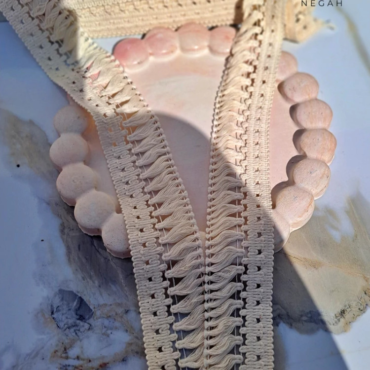 یراق ریشه ایی جنس کنفی رنگ کرم عرض 7 سانت کار بسیار سبک مخصوص لباس های تابستونی و خنک مناسب برای تزیین لبه لباس -مانتو - کت - برای تزیین دور کمر یا دور مچ یا حتی روی لباس قیمت هر متر 50 هزار تومن