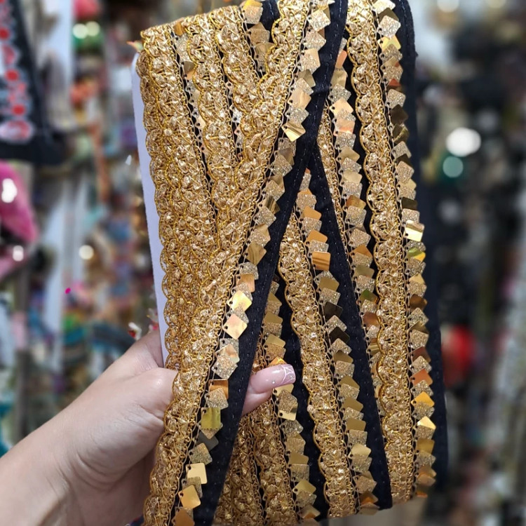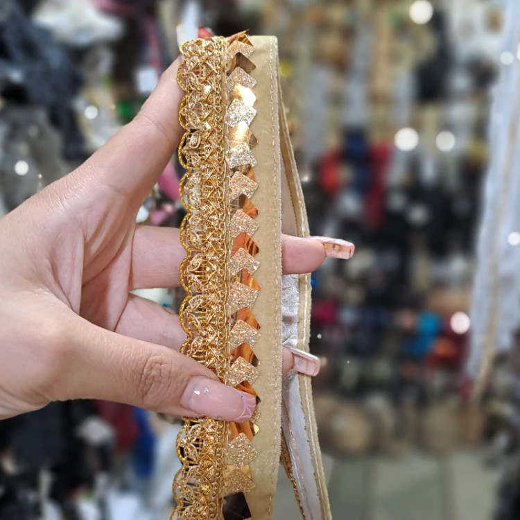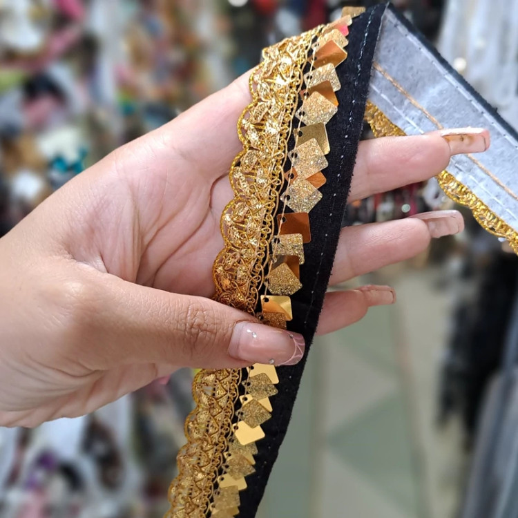 توضیحات👇👇👇👇👇 ⭐⭐⭐⭐⭐⭐⭐⭐⭐⭐ یراق سنتی پولک دار عرض 3 سانت در دو رنگ مشکی طلایی و کرم طلایی جنس مخمل مناسب انواع لباس- کت -مانتو-کیف-عبا-چادر-صندل و...... فروش بصورت متری قیمت هر متر 60 هزار تومن