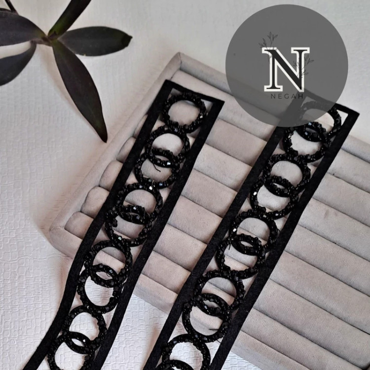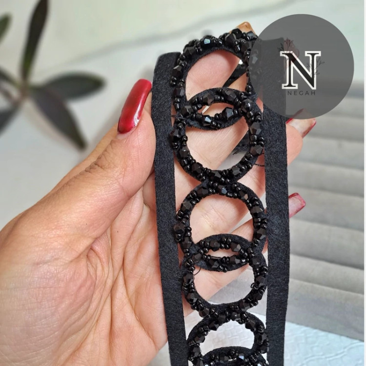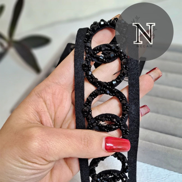 پنل تزیینی عرض 5سانت طول30 سانت فقط رنگ مشکی تمام کار از منجوق و مروارید کریستاله و روی نمد کار شده و راحت میتونید روی لباس بدوزید مناسب تزیین لبه استین ، پایین کت ،دور کمر و... جفتی 240 هزار تومن