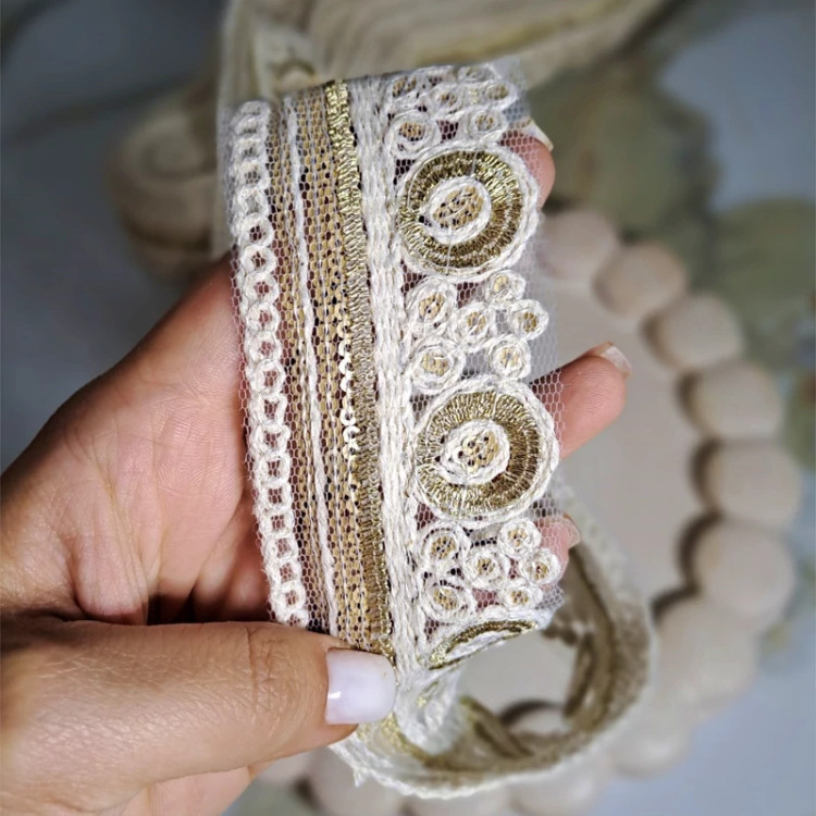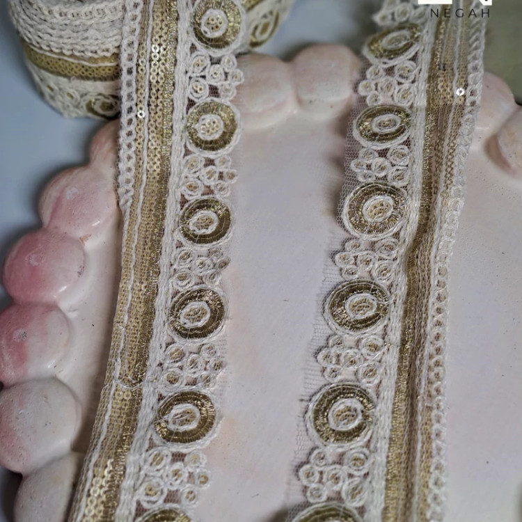 یراق خامه دوزی شده رنگ کرم و با خطای طلایی عرض 5 سانت چون سبکه به همه مدل پارچه ایی میشینه مناسب تزیین لبه انواع لباس - دور استین - دور کمر - لبه شلوار - روی صندل قیمت هر یک متر 140 هزار تومن