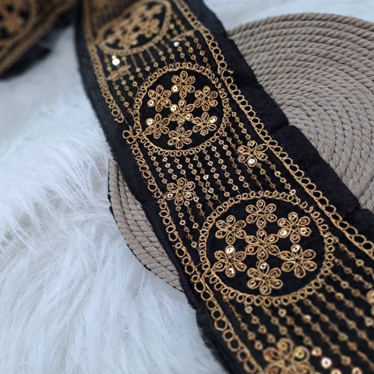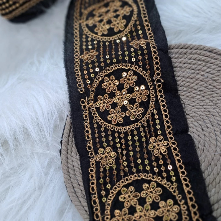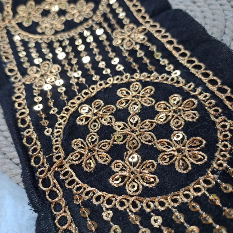 یراق سنتی پهن جنس مخمل قیطون دوزی شده با پولک رنگ مشکی طلایی عرض 10 سانت مناسب مانتو-لباس -کیف-صندل -کفش سنتی قیمت هر متر 150هزار تومن