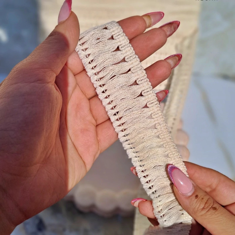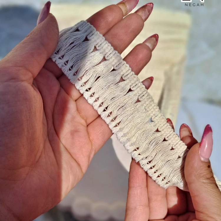 یراق ریشه ایی رنگ کرم عرض 5 سانت مناسب لباس ها و پارچه های تابستونی مناسب تزیین لبه لباس یا کت - مناسب تزیین دور استین - کمر - پایین لباس و حتی روی صندل قیمت هر متر 40 هزار تومن