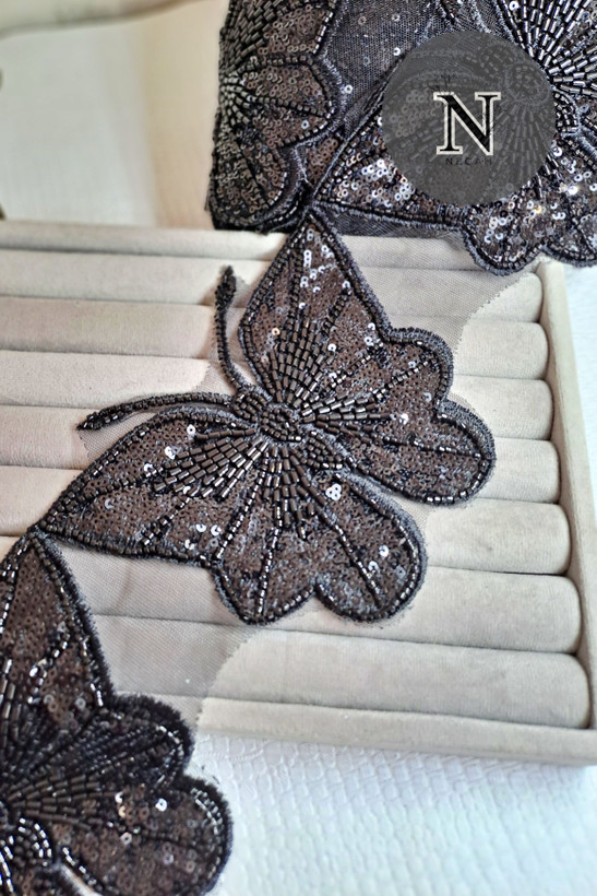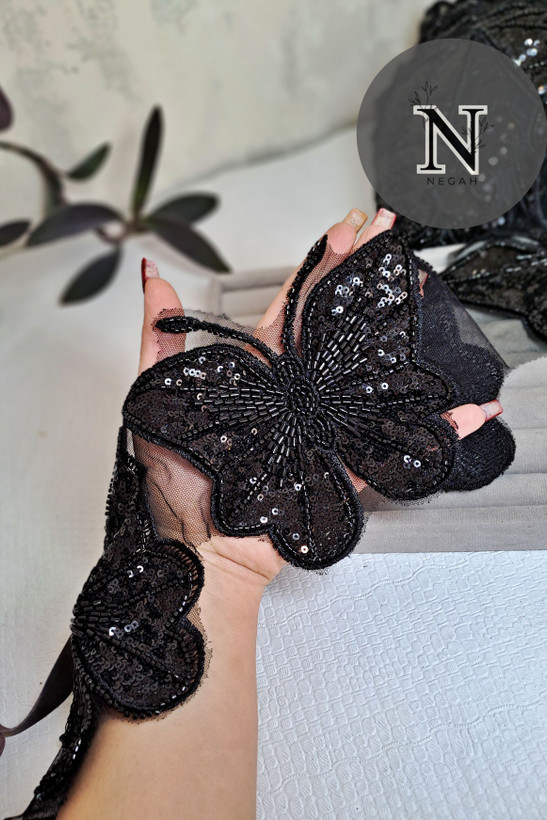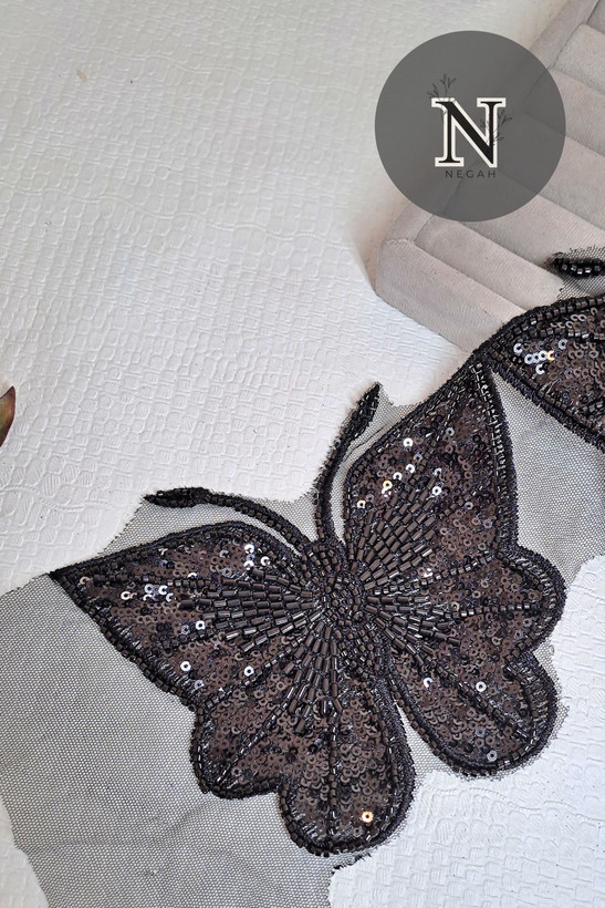 اپلیکه مدل پروانه رنگ مشکی اندازه هر پروانه 20 سانت مناسب دیزاین انواع لباس - مانتو - شلوار - دامن قیمت هر عدد پروانه 120 هزار تومن