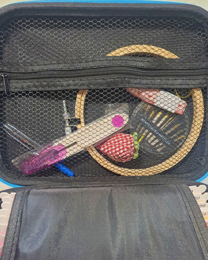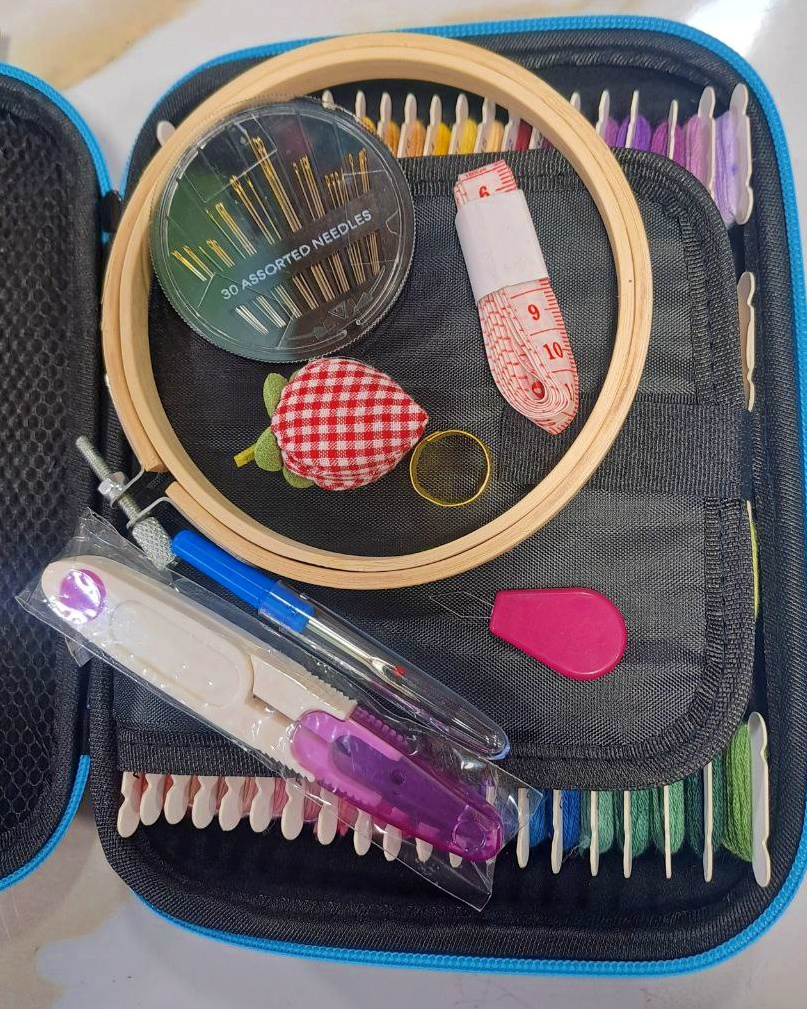 همهی اقلام درون یک کیف زیبا و کاربردی قرار گرفتهاند تا وسایل گلدوزی شما همیشه منظم و در دسترس باشند.